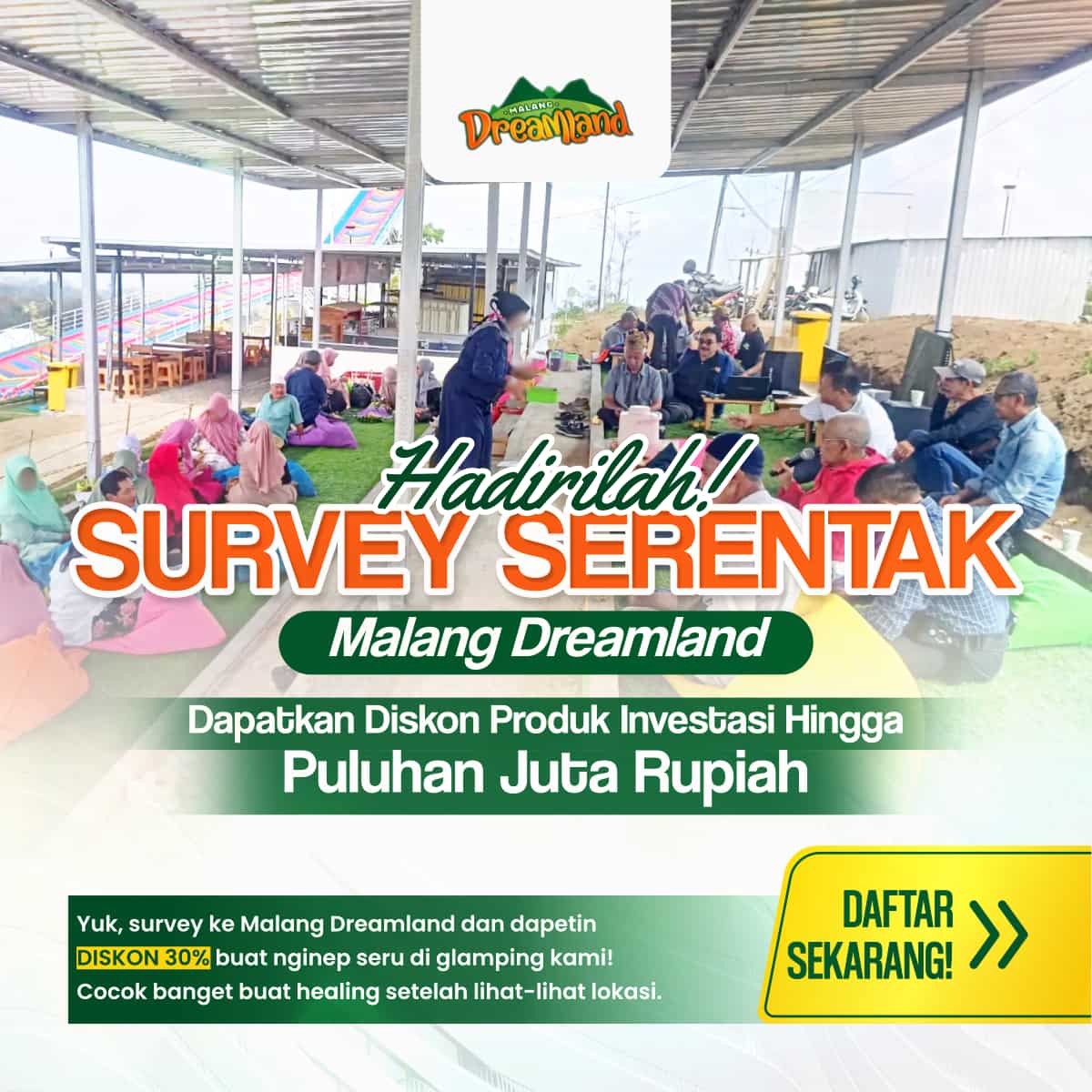 Survey serentak adalah kunjungan langsung ke lokasi Malang Dreamland bersama calon pembeli lainnya. Anda bisa melihat langsung kondisi lahan, lingkungan sekitar, serta mendapatkan penjelasan detail dari tim pemasaran.